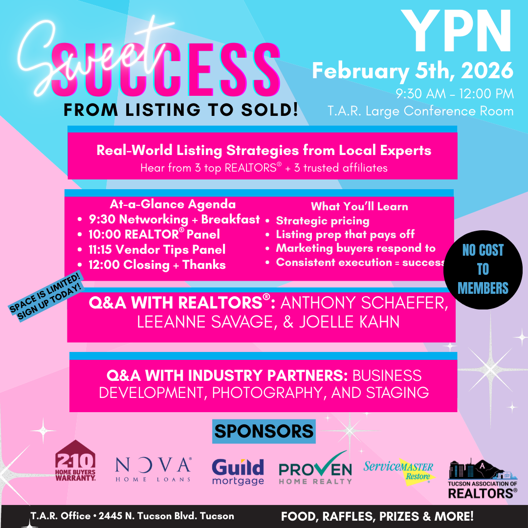 05 Feb YPN Sweet Success: From Listing to SOLD! YPN Sweet Success: From Listing to SOLD! Thursday, February 5, 2026 (9:30 AM to 12:00 PM) 2445 N Tucson Blvd Details You're Registered! DescriptionLocation 9:30-9:45 AM– Breakfast/Networking 9:45 AM – Welcome from Ashley, Chair of YPN 10:00 -11:00 AM – Panel Presentation – Realtors Pricing prep, marketing, strategies, success stories, etc. This will be set up in a question format. Panelists-REALTORS®: 11-11:15 AM – Snack Break/Networking 11:15 AM-12:00 PM – Panel Presentation #2 – Supporting Vendor 2445 N Tucson Blvd