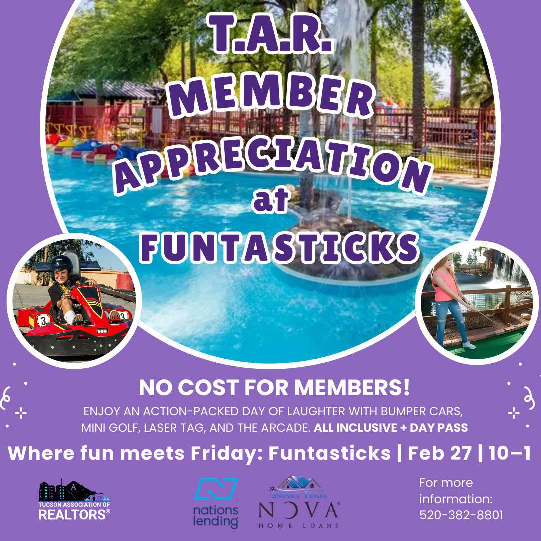 27 Feb TAR Member Appreciation TAR Member Appreciation Friday, February 27, 2026 (10:00 AM to 1:00 PM) 221 E Wetmore Rd Details You're Registered! DescriptionLocation 2/27/26 All members and their families are invited to a no-cost, all-inclusive Member Appreciation Day packed with nonstop fun at Funtasticks. Space is limited; please register as soon as possible. Includes unlimited Go-Karts, Bumper Boats, Laser Tag, Mini Golf, Kiddie Rides Ropes Course, and $10 Arcade voucher Food and & Non-alcoholic Drinks included 10:00am - 1:00pm Funtasticks Family Fun Park 221 E Wetmore Rd, Tucson, AZ 85705 221 E Wetmore Rd Tucson, AZ 85705