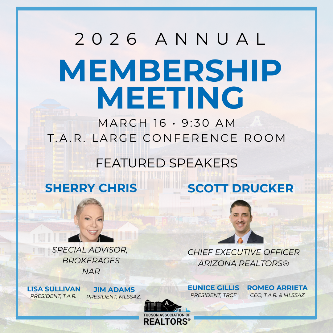 16 Mar Annual Membership Meeting Annual Membership Meeting Monday, March 16, 2026 (9:30 AM to 12:00 PM) TAR Large Conference Room Registration at 9am Details You're Registered! DescriptionLocation The Annual Membership meeting will include: A report from the Nominating and Credentials Committee Hear from candidates running for an elected TAR Board of Director position (Officers and Directors). Updates from: Sherry Chris, Special Advisor to the CEO, National Association of REALTORS® Scott Drucker, Arizona REALTORS® CEO Lisa Sullivan, TAR President Jim Adams, MLSSAZ President Eunice Gillis, TRCF President RAPAC Update and more TAR Large Conference Room 2445 N Tucson BlvdTucson, AZ 85716 Map & Directions